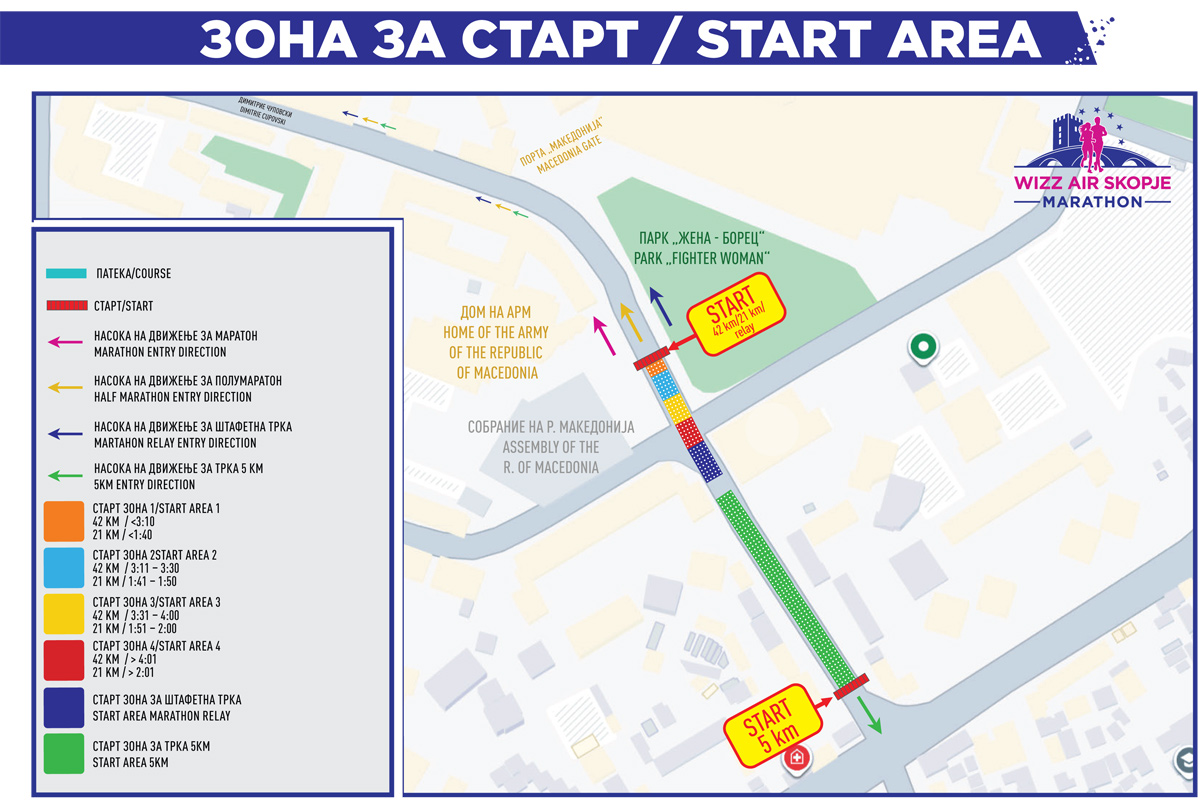 Приказ на патеките на Виз Ер Скопски маратон 2025 Патека на трчање за маратон, полумаратон и штафетен маратон симни ја мапата Патека на трчање за трката на 5км Зона на старт Измена на штафета 1 и 3 (на 1 чека тој што му завршува стартниот број со 2, на 3 чека тој што му завршува стартниот број со 4) Измена на штафета 2 (на 2 чека тој што му завршува стартниот број со 3)